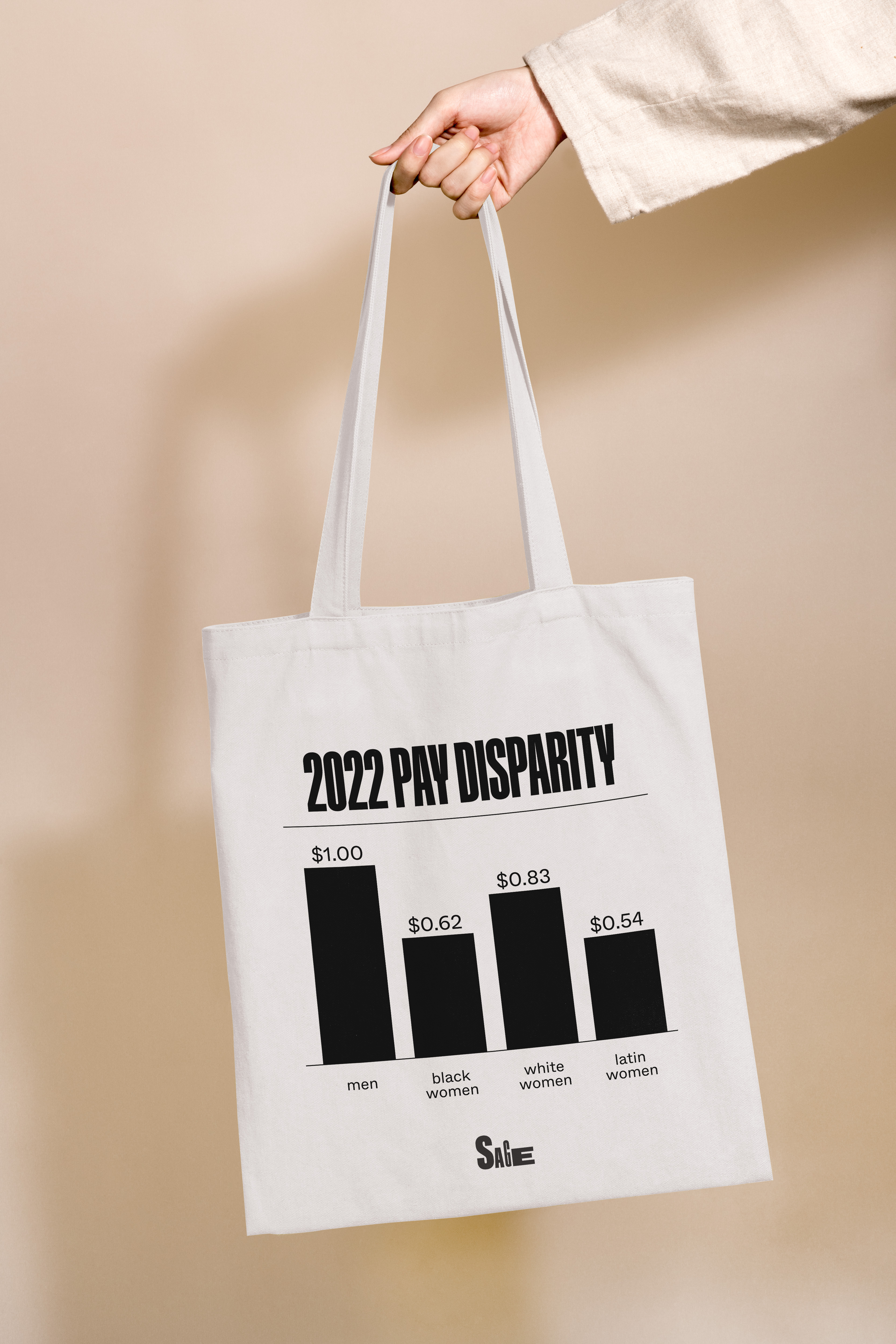 We created a dynamic logo to match the reality of the gender wage gap. The current letter height for each character represents one of the four values represented in the Women’s Wage Gap 2022 chart. For example, the “S” represents $1.00, while the “A” represents $0.83 of that one dollar. Our hope is to continue updating the logo as the years progress until all of the characters align.